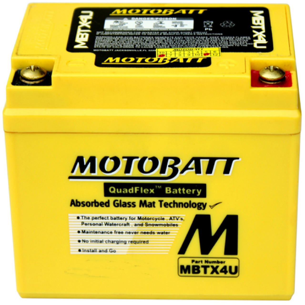 Powersports enthusiasts are all about get-up-and-go action! Motobatt batteries exemplify the powersports lifestyle. Simply install and go. Motobatt batteries without any initial cranking required. Once installed, you don't have to worry about acid leaks or spills because Motobatt batteries come sealed from the factory. You never have to fill or top-off a Motobatt battery.