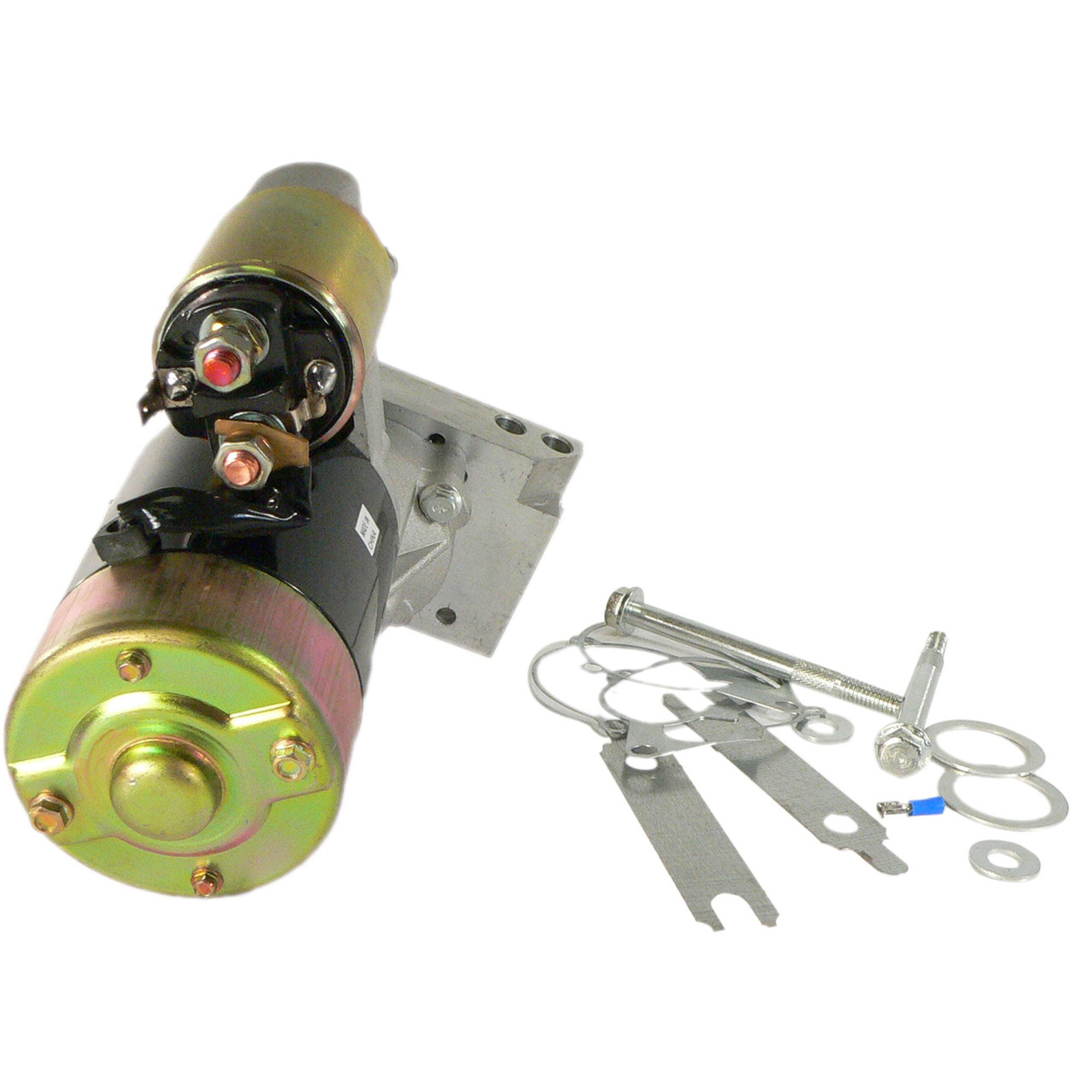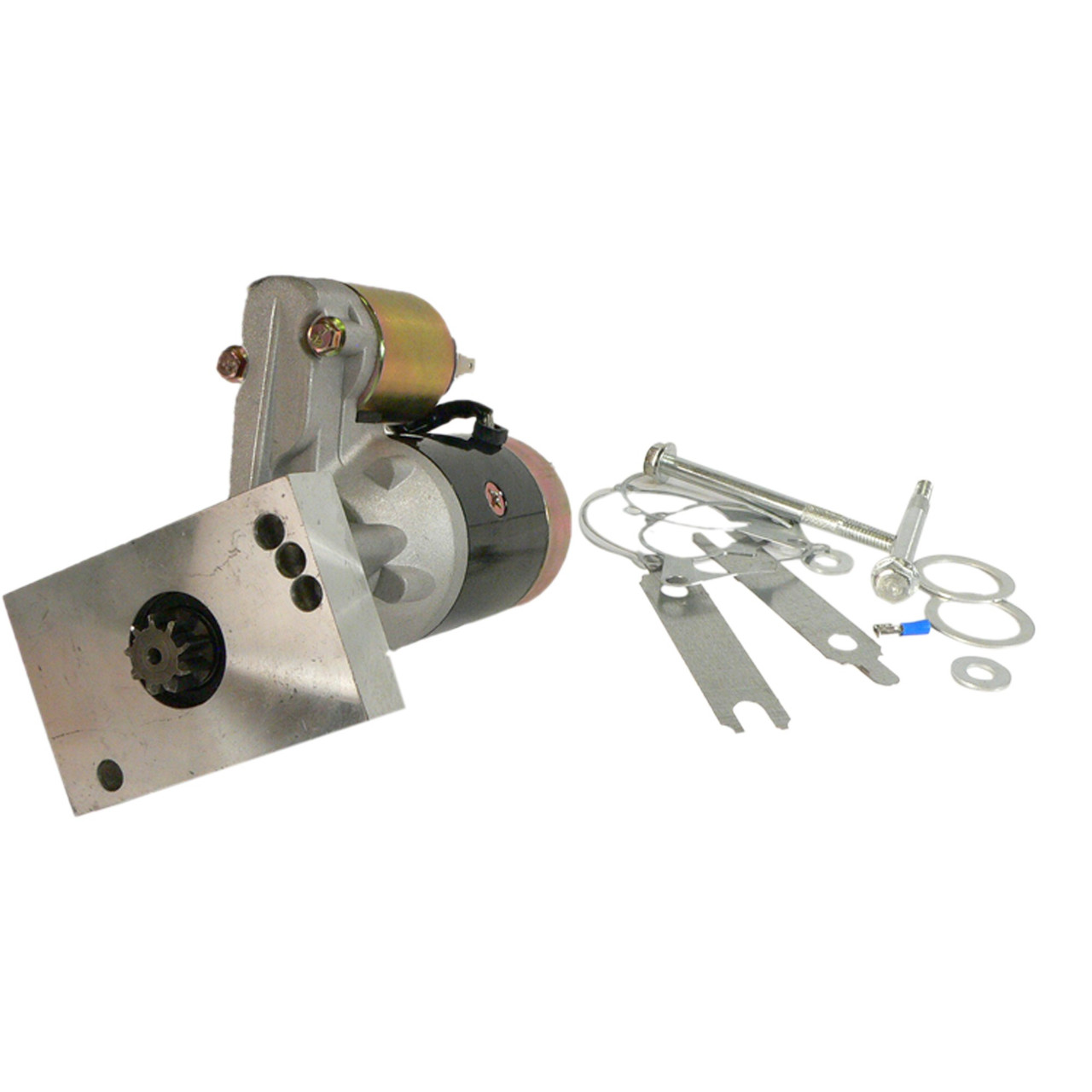Compact gear reduction starter design for easy installation. Weighs only 11.2 pounds- much lighter than your stock starter. 2.5 times more torque than your original equipment. The high torque gear reduction solution to your hot starting problems. Gear reduction design generates a powerful 185 ft. lbs. of torque. Will easily start 15:1 high compression Chevy engines. Mounting block will adjust to give header clearance. High torque, high performance gear reduction design for maximum power.Superior gear reduction high torque quality.